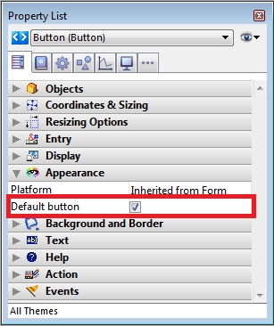 Default button object can be used to indicate a user’s recommended choice. Only one default button can exist per form page. To assign a default button check the option on the properties list: