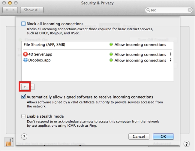 On Mac: the application firewall settings can be found in the Security & Privacy section of the System Preferences, then the rule can be added by clicking the "+" button.