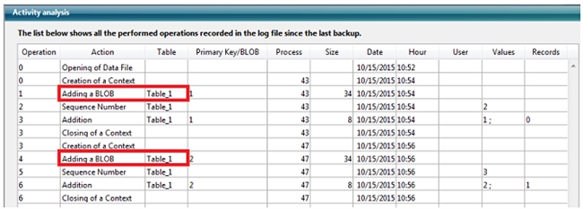 In v15, a record that contains an Object Field will be saved similar to a Text, Picture or Blob Field as a "variable sized container". When displayed in the "Activity Analysis" of MSC, it appears as “Blob”. An example shown below has a table with the following code entering two records in the database: