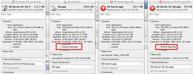 As shown below from left to right are the 'Get Info' windows for 4Dv14 Server 64 Bit, 4Dv14 Server 32 Bit, 4Dv15 Server 64 Bit and 4Dv15 Server 32 Bit: