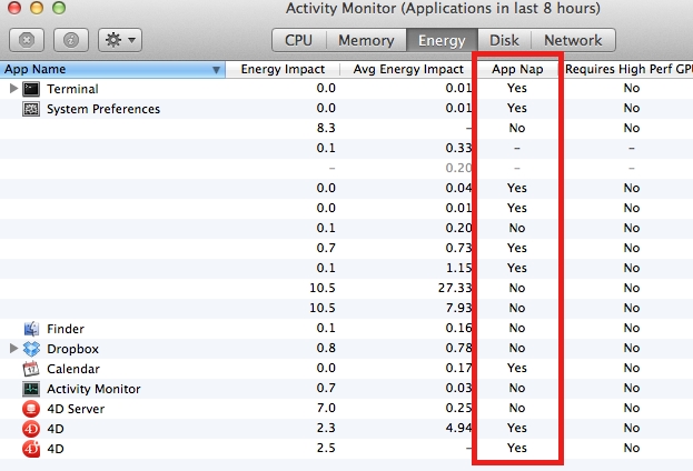 App Nap is a feature introduced in Mac OS X Mavericks that caused unwanted slowdowns for 4D servers that were left to run without regular user interaction.