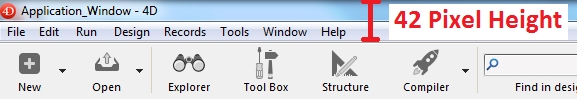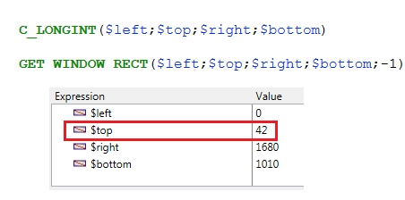 When using the GET WINDOW RECT command while a 4D application window is maximized on the main monitor screen, the top coordinate of the window's contents area displays 42 as shown below: