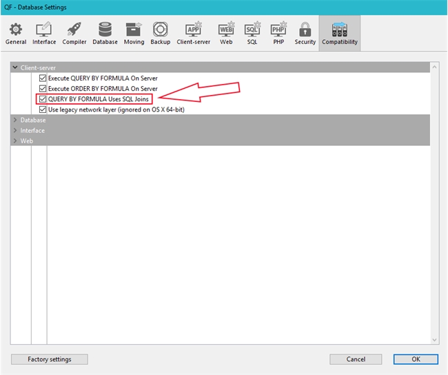 If you have an upgraded database and utilize the built-in Query Editor, you may want to enable the 'QUERY BY FORMULA uses SQL Joins' compatibility option.