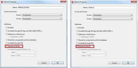 When a method property is either selected to be "Executed on Server" (stored procedure) or not, it can be confusing if that method is called as a process from another method which those properties can be selected to be "Executed on Server" or not as well. Here are some examples of the behavior when the properties are not consistent: