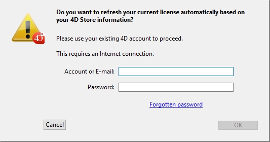 In this case, a dialog box informs you that you are going to be connected to our customer database and that your licenses will be activated (you will need to enter the password for your 4D account).