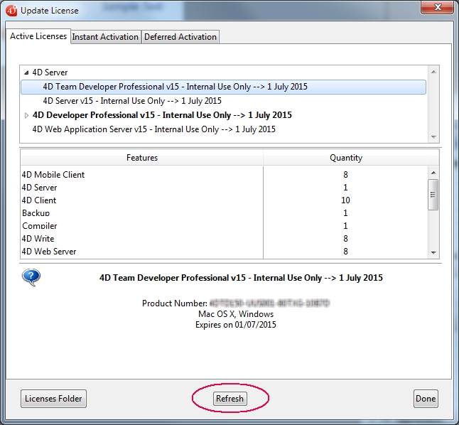 If you purchased additional expansions for a 4D Server, you do not need to enter any license number -- just click Refresh!