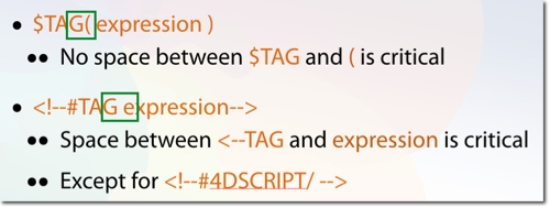 When working with the traditional tags there is a space character between the tag itself and the expression in the tag. When using the new Dollar Sign Syntax there is no space between the tag and the opening parenthisis "(".