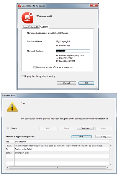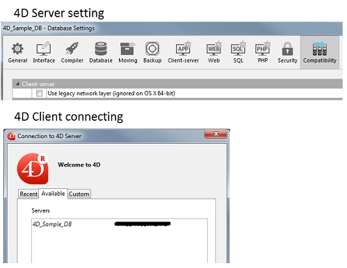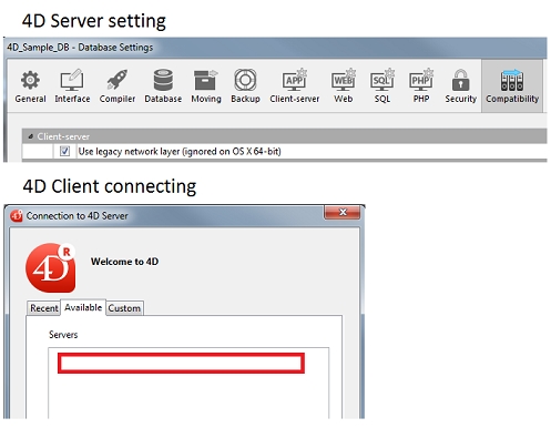 When trying to connect to the 4D Server through the Connection Dialog window under the available tab, the database will not show as shown below: