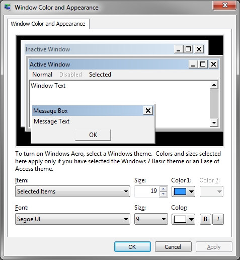Windows: Right click on Desktop->Personalize->Window Color->Advance appearance settings