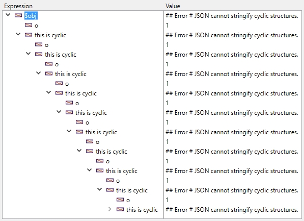 As you can see in the screenshot above, the Cyclic Structure can be expanded infinitely. Another term for this is recursion. Meaning that if it were stringified (written out as text), the text would go on forever and eventually fill the hard drive.