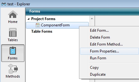 To allow a component form to be accessed from a host database a setting must be accessed from the Form's Properties in the Explorer as shown in the image below.