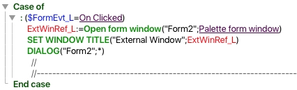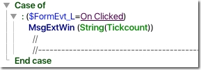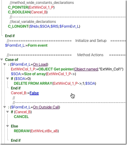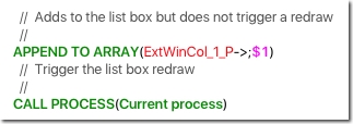 The code called from the "Message External Window" button is shown above. Becasue this code does not run in the external window it does not trigger a redraw event of the list box. To get the data to appear immediately in the list box, the command CALL PROCESS(Current process) is used to trigger the code contined in the "On Outside Call" form event of the external window, shown in the form method image, third from the top above.