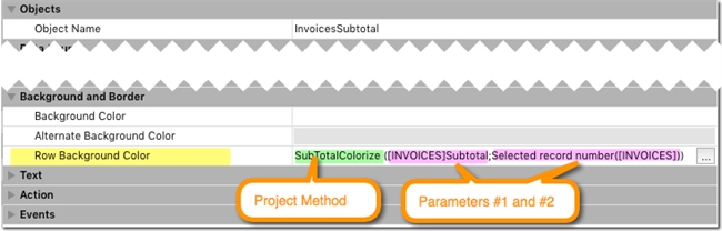 To apply a custom background color at the cell level a project method has to be installed in the column property Row Background Color, highlighted in yellow below. The property accepts a 4D Expression. The 4D Expresison is a project method, SubTotalColorize, is highlighted in green and the two parameters are highlighted in purple. SubTotalColorize is called for every row as it is about to be rendered the list box, even when being sorted by a click in a header.