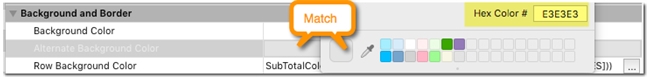To honor the Alternate Background Color, its hex value must be captured for use in the SubTotalColorize project method. This can be done using the color picker that can be invoked by clicking in the second column of the property.