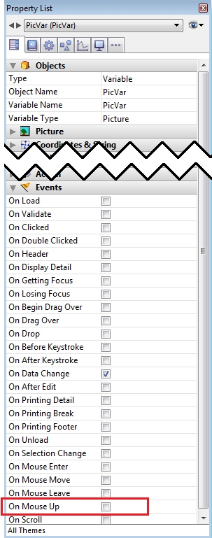 The new event can be toggled on in the property list for picture variables objects and picture field objects only. With the event a new command has been added to assist with tracking and reacting to the user. This command is Is waiting mouse up, which is designed to prevent an issue in which an object is being moved, but an external event interrupts the process and the object does not receive an On Mouse Up event which will prevent the process from ever completing.