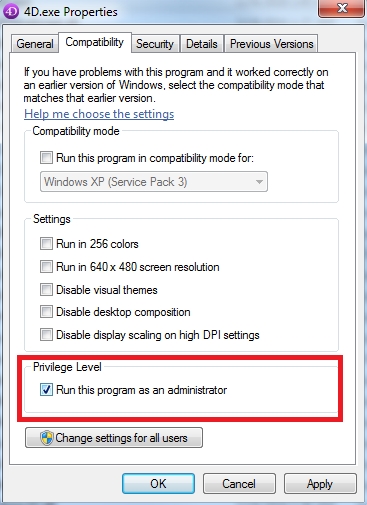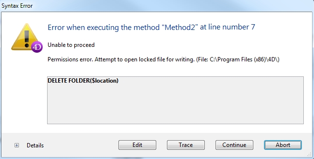 This may be due to the file(s) requiring elevated privaledges to perform the action. An easy way to work around this issue is to run the 4D application in administrative mode. This can be done automatically by modifying the properties of the shortcut or executable: