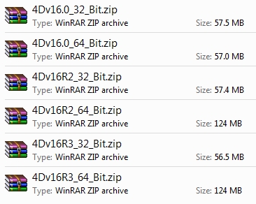 Below is an image containing zipped folders of 32 and 64 bit versions of the 4D folder for v16.0, v16R2, and v16R3. Notice the increase in size for v16R2 and v16R3 64 bit versions.