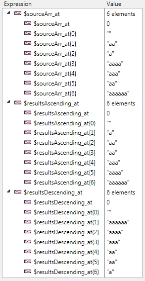 | ARRAY TEXT($sourceArr_at;0) APPEND TO ARRAY($sourceArr_at;"aa") APPEND TO ARRAY($sourceArr_at;"a") APPEND TO ARRAY($sourceArr_at;"aaaa") APPEND TO ARRAY($sourceArr_at;"aaa") APPEND TO ARRAY($sourceArr_at;"aa") APPEND TO ARRAY($sourceArr_at;"aaaaaa") ARRAY TEXT($resultsAscending_at;0) ARRAY TEXT($resultsDescending_at;0) Util_Array_Text_Length_Sort (->$sourceArr_at;->$resultsAscending_at) Util_Array_Text_Length_Sort (->$sourceArr_at;->$resultsDescending_at;-1) TRACE |