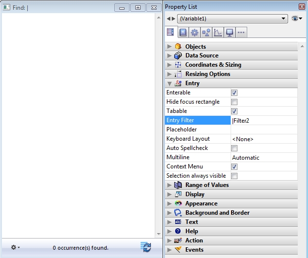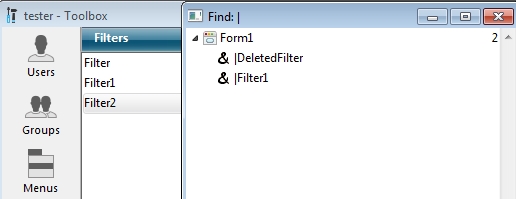 The Find in design tool is able to find all cases in which a custom defined Filter has been applied to an Object's Alpha Format property. These are filters that have been created in the Toolbox > Filters window.