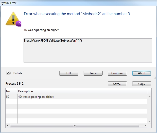 | $textVar:="[{\"Name\": \"Value\"}]" $objectVar:=JSON Parse($textVar) $resultVar:=JSON Validate($objectVar;"{}") |