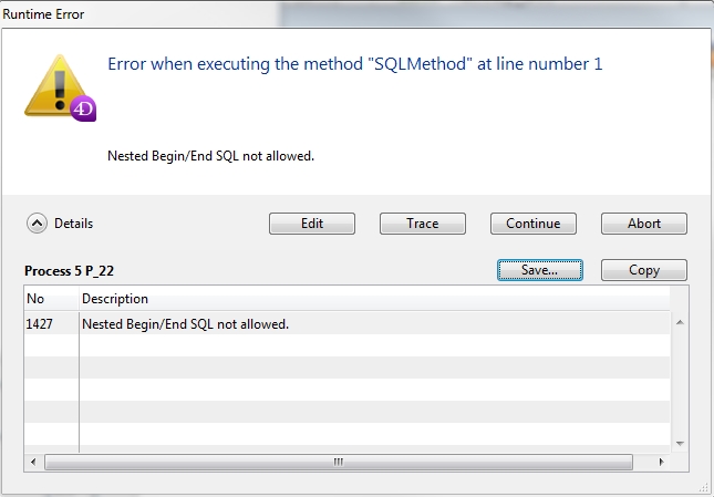 4D allows SQL calls to be made in in standard SQL format inside Begin SQL and End SQL calls. However, in certain situations, coding may attempt to initialize and run another Begin SQL and End SQL call and this is not allowed.