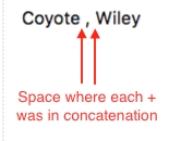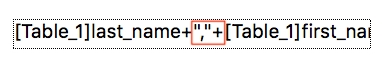 In the example table form, a space is explicitly added on the concatenation of the last_name, comma, and first_name, and only one space is seen on the final label with preview: