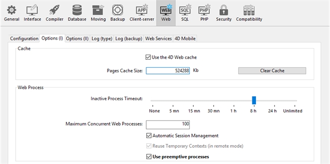 To run the Web server in preemptive mode, check the option Use preemptive processes under Web>Option (I) in the Database Settings.