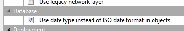 This allows JSON Stringify to translate dates into YYYY-MM-DD format and allows JSON Parse to parse date values into one of three formats set with the SET DATABASE PARAMETER command and the Dates inside objects (85) selector: