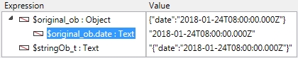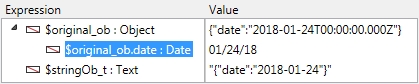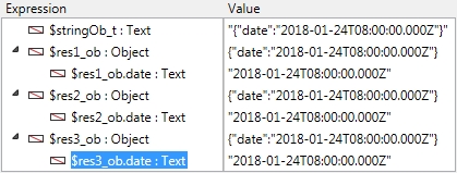 | $stringOb_t:="{\"date\":\"2018-01-24T08:00:00.000Z\"}" SET DATABASE PARAMETER(Dates inside objects;String type without time zone) $res1_ob:=JSON Parse($stringOb_t) SET DATABASE PARAMETER(Dates inside objects;String type with time zone) $res2_ob:=JSON Parse($stringOb_t) SET DATABASE PARAMETER(Dates inside objects;Date type) $res3_ob:=JSON Parse($stringOb_t) TRACE |