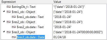| $stringOb_t:="{\"date\":\"2018-01-24\"}" SET DATABASE PARAMETER(Dates inside objects;String type without time zone) $res1_ob:=JSON Parse($stringOb_t) SET DATABASE PARAMETER(Dates inside objects;String type with time zone) $res2_ob:=JSON Parse($stringOb_t) SET DATABASE PARAMETER(Dates inside objects;Date type) $res3_ob:=JSON Parse($stringOb_t) TRACE |