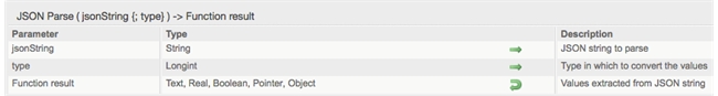 | C_TEXT($json_string;$name_t) C_OBJECT($output_obj) $json_string:="{\"name\":\"Kristopher\",\"company\":\"4D Inc\",\"location\":\"San Jose\",\"employed\";true}" $output_obj:=New Object $output_obj:=JSON Parse($json_string) $name_t:=$output_obj.name |