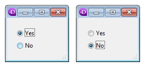 | //Create Yes Radio Button $rb1_b:=New object("text";"Yes";"top";20;"left";20;"width";150;"height";20) $rb1_b.type:="radio" $rb1_b.radioGroup:="radioYN" //Create No Radio Button $rb2_b:=New object("text";"No";"top";45;"left";20;"width";150;"height";20) $rb2_b.type:="radio" $rb2_b.radioGroup:="radioYN" //Add radio buttons to Page 1 $page1_o:=New object("objects";New object("rb1";$rb1_b;"rb2";$rb2_b)) //Add Page 1 to Form $form_o:=New object("rightMargin";20;"bottomMargin";20) $form_o.pages:=New collection(Null;$page1_o) // Load the form dialog $win_l:=Open form window($form_o) DIALOG($form_o) |