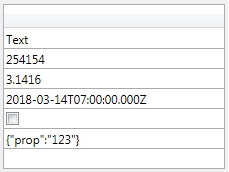 | C_COLLECTION($col) C_OBJECT($obj) OB SET($obj1;"prop";"123") $col:=New collection("Text";254154;3.1416;Current date;false;$obj) EXPORT_COLLECTION_TO_LB_COL($col;->Column1) |