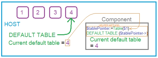 If the default table is set in the host database, then within the host database calls to Current default table will return a pointer to that table. This is because the context of the default table in the host database is set. A call to Current default table then from a method in the component will return a nil pointer because of the context of the call. See the below image which illustrates this point.