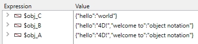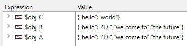 | $obj_A:=New object("hello";"world") $obj_B:=$obj_A $obj_C:=OB Copy($obj_A) $obj_A.hello:="4D!" OB SET($obj_A;"welcome to";"object notation") $obj_B["welcome to"]:="the future" |
