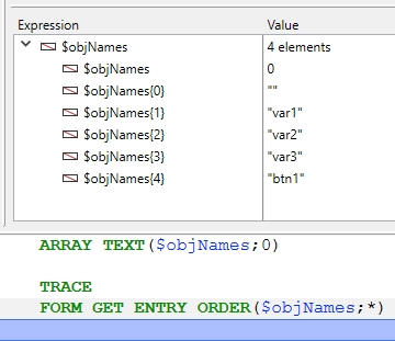 By default, a button placed on a form is not focusable, and the object property needs to be turned on. After selecting the focusable property for the button, it may be expected that the button would appear in the $objNames array, but it does not!