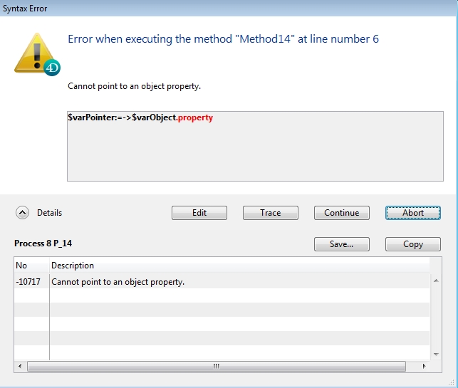 | C_OBJECT($varObject) C_POINTER($varPointer) $varObject:=New object("property";New object("subProp";"Hello")) $varPointer:=->$varObject $resultProperty:=$varPointer->["property"] $resultSubProp:=$varPointer->property.subProp TRACE |
