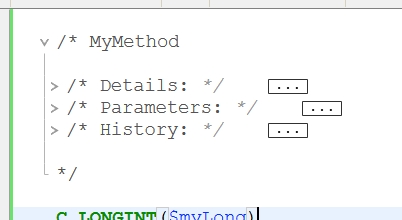 This feature can even be applied to create nested blocks of comments so that information can be collapsed or expanded if needed. For example, the method header below is a comment block with three nested comment blocks for the details, parameters, and history of changes.