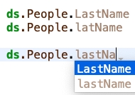 When an invalid field/method name is referenced anywhere in the database, it will also be parsed and included in the suggestion list. For example, if the code has a typo like latName or the field is not in camel case like LastName, the incorrect values will still be included in the autocomplete list: