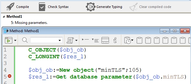 | C_OBJECT($obj_ob) C_LONGINT($res_l) $obj_ob:=New object("minTLS";105) C_LONGINT($temp_l) $temp_l:=$obj_ob.minTLS $res_l:=Get database parameter($temp_l) |