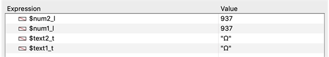 | C_LONGINT($num1_l;$num2_l) C_TEXT($text1_t;$text2_t) $num1_l:=937 $text1_t:=Char($num1_l) $num2_l:=0x03A9 // this will be automatically converted to its decimal value $text2_t:=Char($num2_l) |