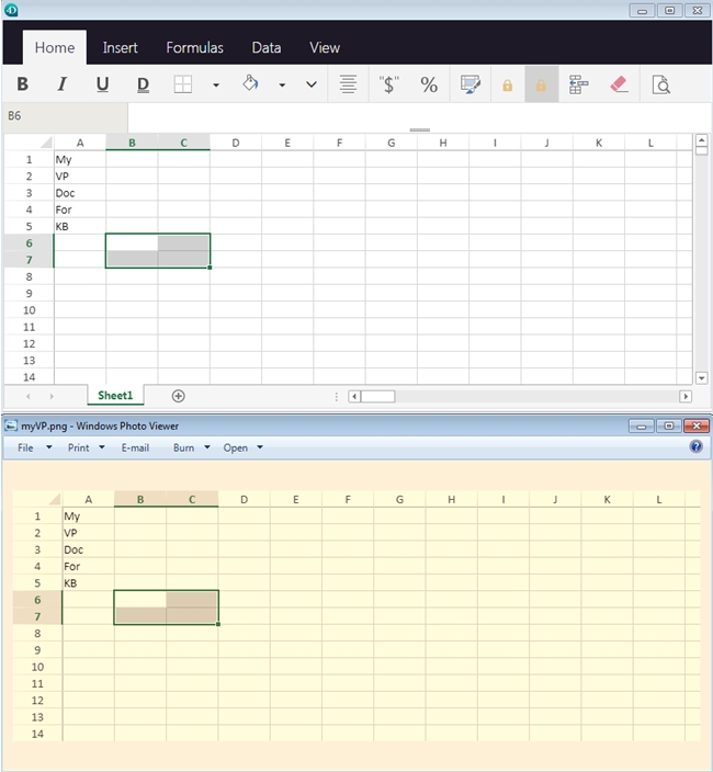 Results of the command, Windows Photo Viewer adds a Yellow/Orange Tint, actaul color is correct. Notice that the markers highlighting the active cells, rows, and columns are also captured, so it may be useful to click off to a cell not being displayed.