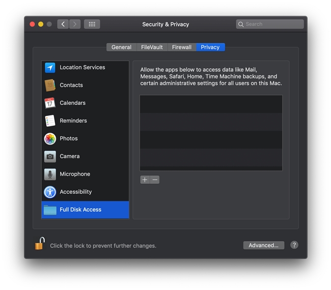 Apple introduced a new Security & Privacy option called Full Disk Access in MacOS Mojave.