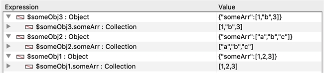 When parsing JSON strings and accessing arrays within the parsed object, javascript arrays are now typed as collections in contrast to v16 where they were typed as object arrays. Regardless of whether the javascript array only contains one or multiple data types, they are always typed as collections as shown below.