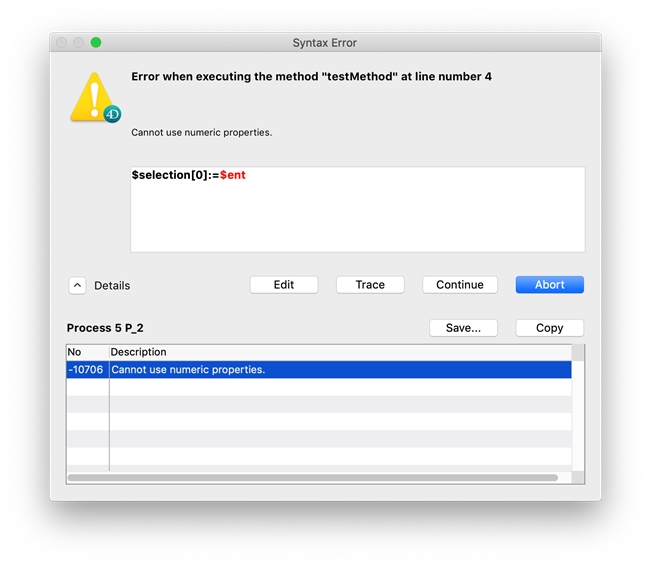 | C_OBJECT($selection_e;$ent_e) $selection_e:=ds.Table_1.all() $ent_e:=ds.Table_1.new() $selection_e[3]:=$ent // invalid assignment |