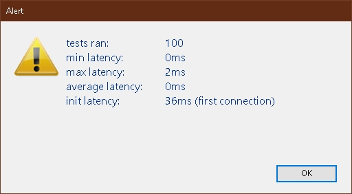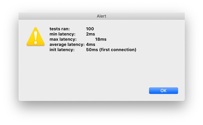| C_LONGINT($beginMS;$endMS;$a;$min;$max;$i;$end) ARRAY LONGINT($al_latency;0) C_TIME($trash) C_TEXT($crlf;$tab) $crlf:=Char(Carriage return)+Char(Line feed) $tab:=Char(Tab) $end:=100 For ($i;0;$end) $beginMS:=Milliseconds $trash:=Current time(*) $endMS:=Milliseconds APPEND TO ARRAY($al_latency;$endMS-$beginMS) End for $init:=$al_latency{1} DELETE FROM ARRAY($al_latency;1;1) $a:=Average($al_latency) $min:=Min($al_latency) $max:=Max($al_latency) $msg:="" $msg:=$msg+"tests ran: "+$tab+$tab+String($end)+$crlf $msg:=$msg+"min latency: "+$tab+$tab+String($min)+"ms"+$crlf $msg:=$msg+"max latency: "+$tab+$tab+String($max)+"ms"+$crlf $msg:=$msg+"average latency: "+$tab+String($a)+"ms"+$crlf $msg:=$msg+"init latency: "+$tab+$tab+String($init)+"ms (first connection)"+$crlf ALERT($msg) |