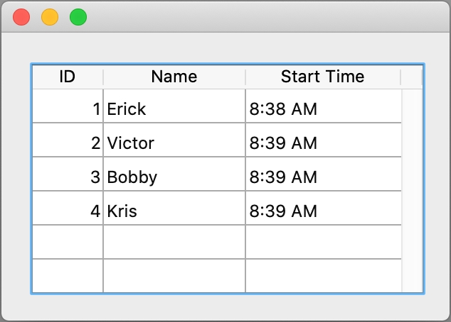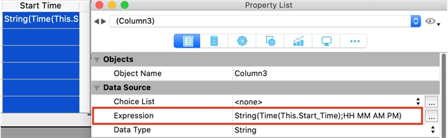 Since displaying time as the seconds longint format is not very easy to read in terms of reading time, you can format it by converting the data to time type using the Time command, then convert to a string using the String command in the time column's expression field in the property list window. In this case, the time column will be formatted to HH MM AM PM.