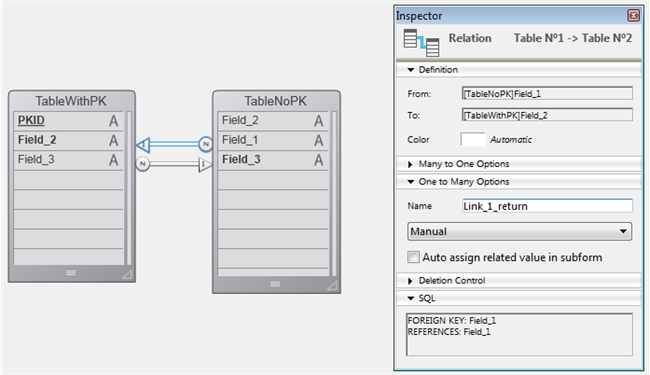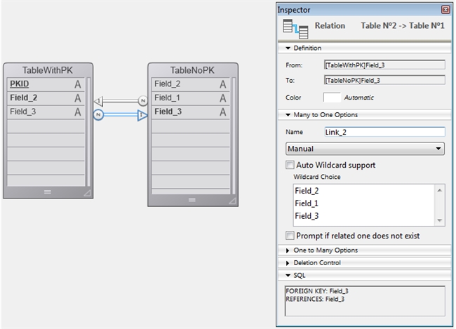 With the relations above, since "TableNoPK" does nto have a primary key the following two will not work
