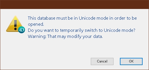 It is important to understand that although clicking OK will allow you enter the database, it will not change the current Unicode setting. Therefore subsequent attempts to open the database will reveal the same dialog again unless the underlying unicode setting is change permanently.