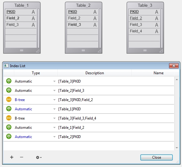 As shown below, the font of the Type values for the indexes for [Table_1]PKID, [Table_2]PKID, and the composite index for the composite Primary Key fields [Table_3]PKID and [Table_3]Field_2 are blue.